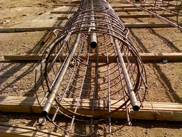 在石灰岩地域,由于打孔不好,钢筋笼下沉艰难,采用十分规措施使声管变形梗塞桩头折断时,工人不慎掉入混凝土小砌块内形成堵管。声管的变形和梗塞给检测工作带来了极大的艰难,以至无法检测。